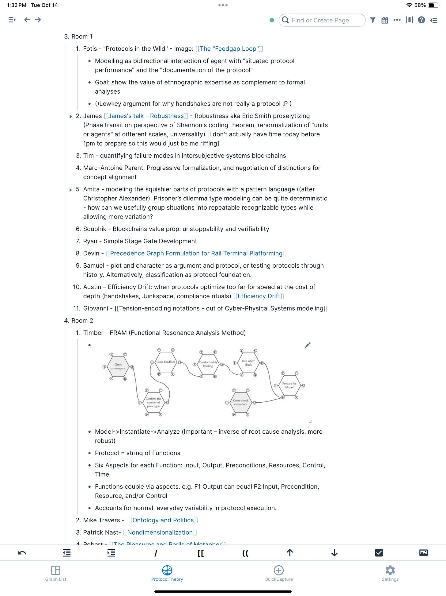 We had some pretty intense and wide-ranging lightning talk sessions (see screenshot below from our Roam graph for a sense of the proceedings), and then attempted to synthesize the discussions into a coherent map of the territory, and an agenda for continuing discussions and work.