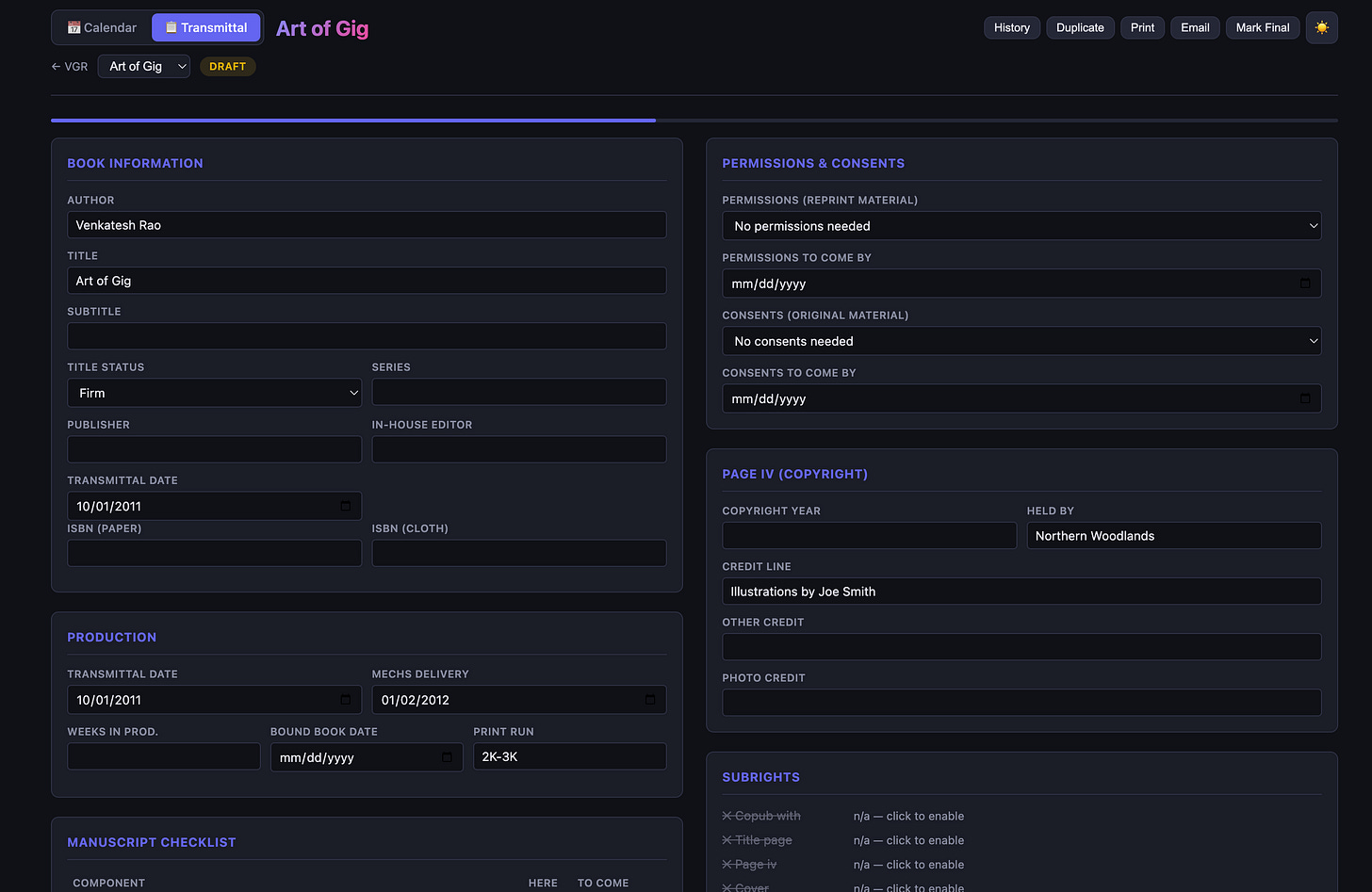 The handoff point between us is a shared Dropbox folder plus a “manuscript transmittal” server she’s set up for metadata. Here’s my “account” view of her factory: