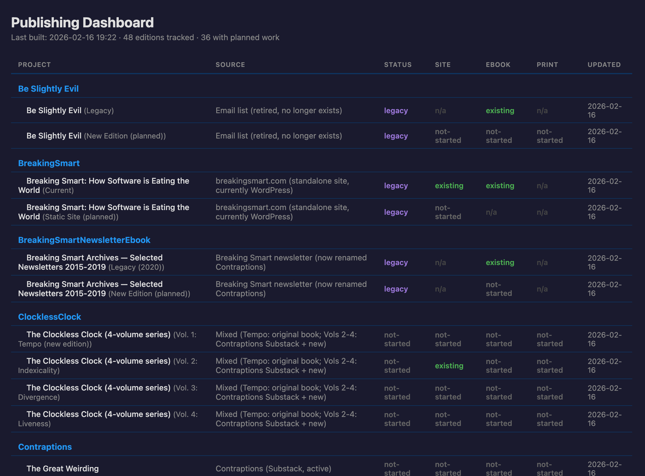I started my first week of using Claude Code by producing an online book of my Twitter archive, but I ended it by setting up an entire book manuscript production factory. Currently, my factory dashboard shows a couple of dozen book projects in flight, most derived from two decades worth of my personal blog and newsletter archives (including new editions of old books), and a handful of from-scratch projects.