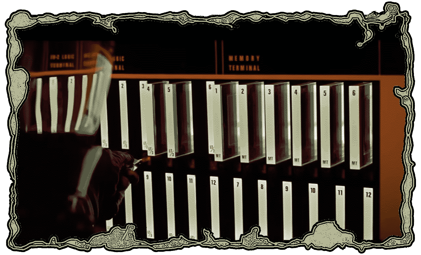 This is one image of memory we have in pop culture. Other shared images of memory related to digital technologies might include a USB on your keychain or, for some of us, the translucent, colored memory cards of early game consoles. There might be a faint archival image that comes to mind: people standing in large rooms with terminals spinning magnetic tape or, in other words, an image of an early computer system.