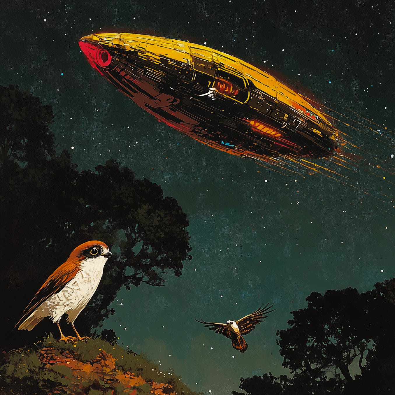Our original art depicted the bird which features in the closing scene as a sudden reminder of the violence of mortality. A space vessel passes in the background – in Witherell’s scenario “personal space travel was as common as taking a bus.”