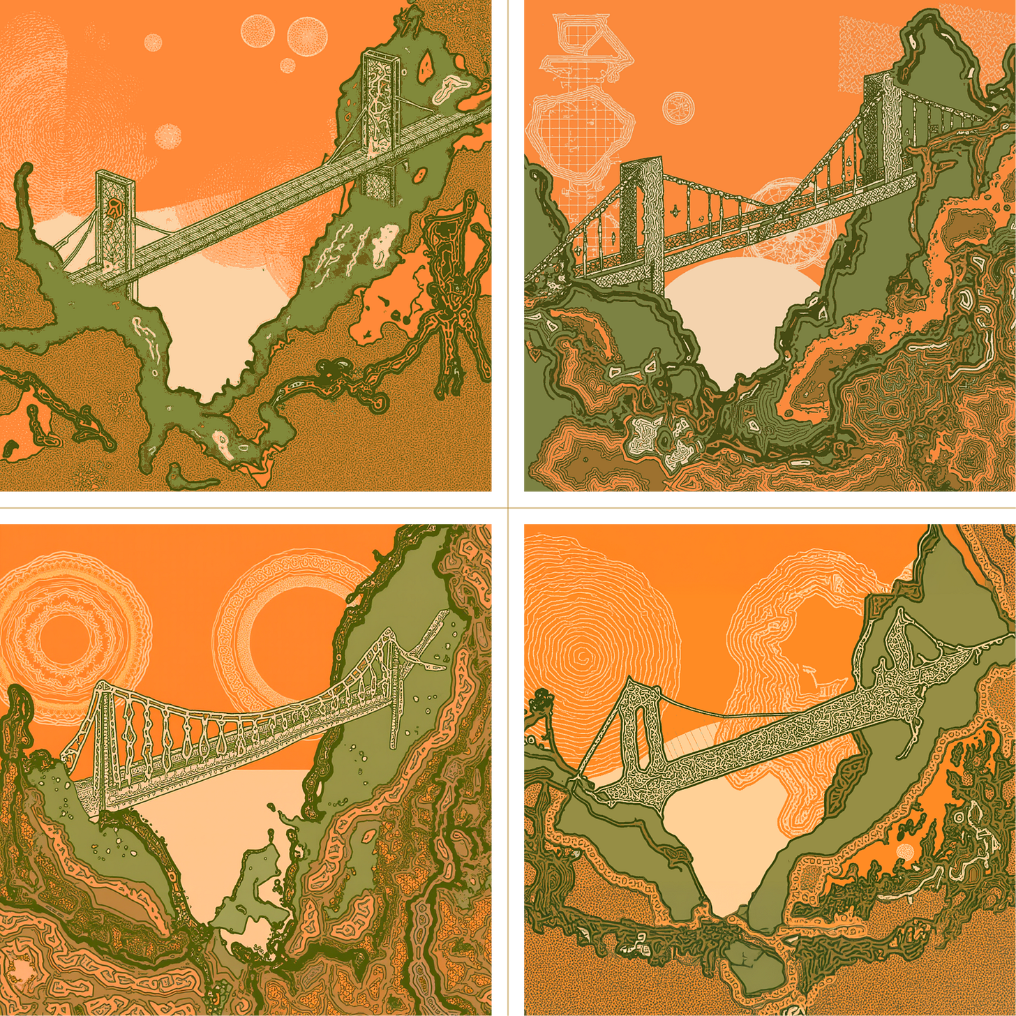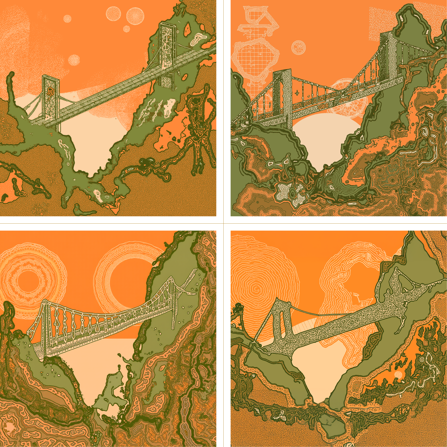The art for our new Bridge Atlas salon series was generated with the hyperpress model. These examples show its outputs modulating between scenic composition and something flatter and more topographic. We used the former direction for a feature image, and the latter for YouTube title cards and thumbnails.