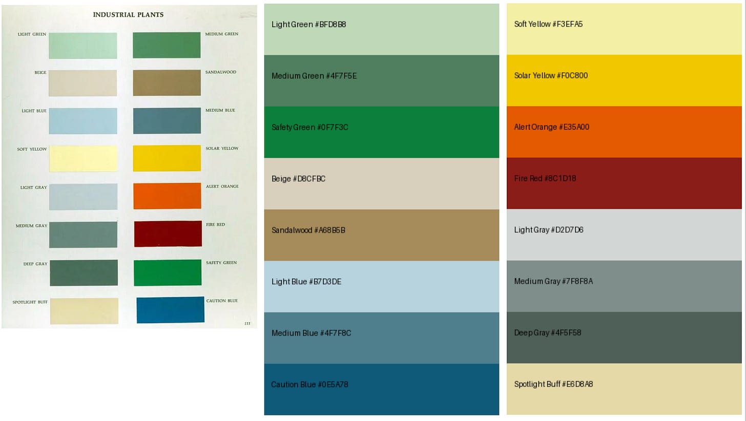 The Birren palette was designed to be a functional color-coding language for safety-first interiors, and meant to be comfortable to inhabit for extended working hours. It was the 1950s visual equivalent of elevator music plus the dings/bells/alarm sounds an elevator is capable of producing.