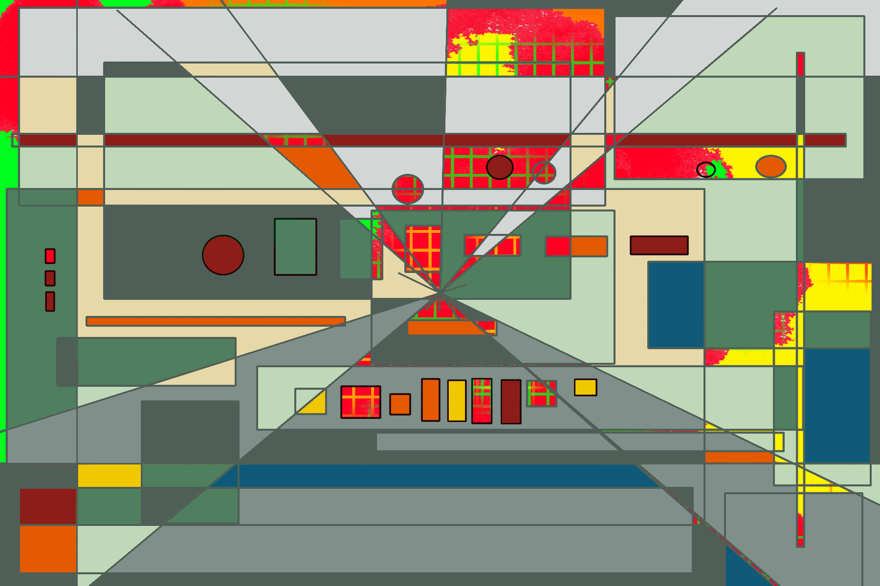 That’s not what I set out to do though. I started out simply wanting to make some nostalgia-aesthetic digital art using the Birren color palette, with a view to possibly training an image model on it with TITLES. Here is my first attempt. I aim to make about 30 such paintings, and then train a model I’ll name Birren. This one is a sort of abstract industrial interior where a Birren-palette foreground partially masks lurking fire risks.